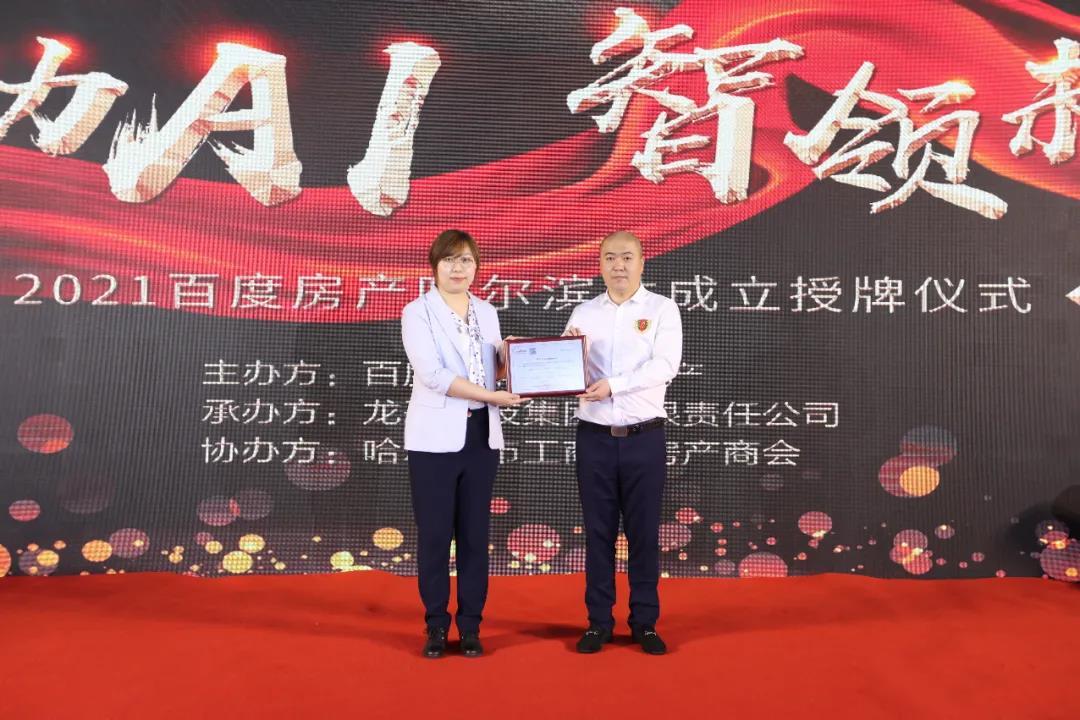 百度房產運營負責人劉悅為龍采科技集團高級副總裁、黑龍江管理區大區總經理王曉磊親自授牌。哈爾濱地區房產精英齊聚一堂,共同見證這一重要時刻。
