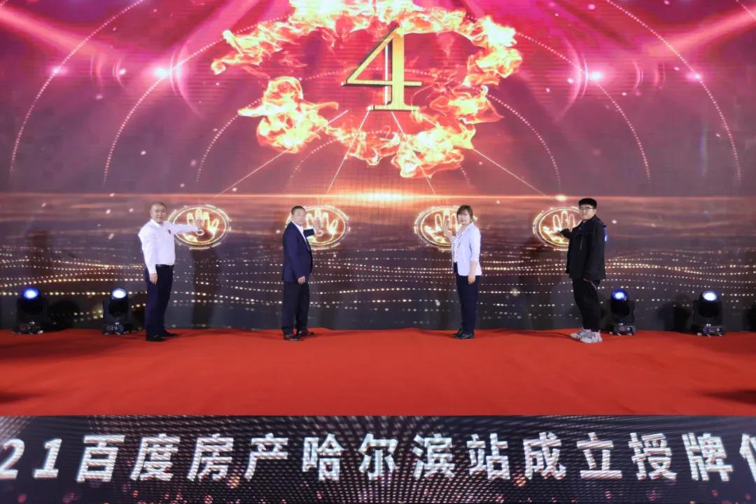 黑龍江省工商聯總商會副會長、黑龍江省房地產商會副會長、黑龍江省寧波商會會長、宏仁集團董事長楊昌仁,百度黑龍江渠道經理丁釗 ,百度房產運營負責人劉悅 ,龍采科技集團高級副總裁、龍采科技集團黑龍江管理區大區總經理王曉磊,匯智成功地產厲春杉上臺,在倒計時中共同啟動授牌儀式。共同來見證2021百度房產哈爾濱站成立。